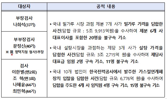 밀가루・설탕 가격 담합, 한국전력공사 발주 입찰 담합으로 국민 생활의 근간이 되는 식품 물가를 왜곡하고, 가정경제를 위협한 서민경제 교란사범을 엄단한 서울중앙지방검찰청 공정거래조사부 부장검사 및 검사(총 6명)에게 표창을 수여했다.