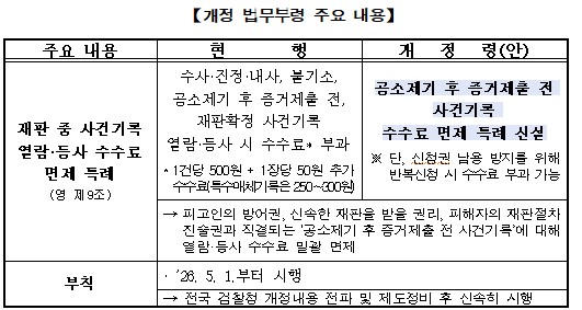 이번 법무부령 개정을 통해, 올해 5월부터 재판 중 사건기록열람·등사를 위해 피고인, 피해자 및 변호인 등이 부담하던 연간 18억 원(약 18만 2,000건) 상당의 수수료가 면제될 예정이다.