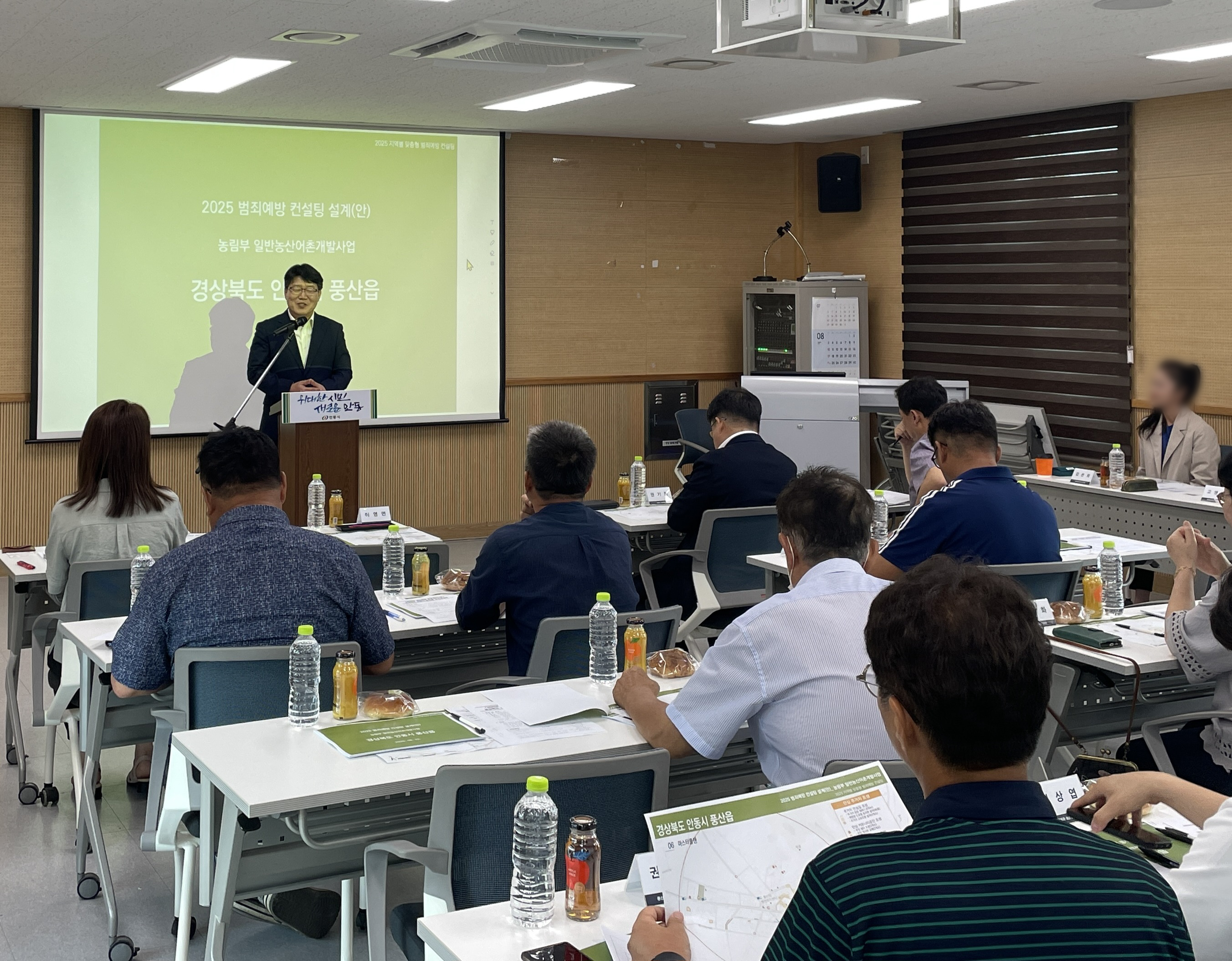 법무부(장관 정성호)는 8월 22일(금) 안동시 풍산농업인상담소에서 지자체 담당자, 주민대표, 관련 분야 전문가 등 25명이 참석한 가운데 ‘2025년 안동시 풍산읍 범죄예방 환경개선 사업 주민공청회’를 개최했다, 고 밝혔다.