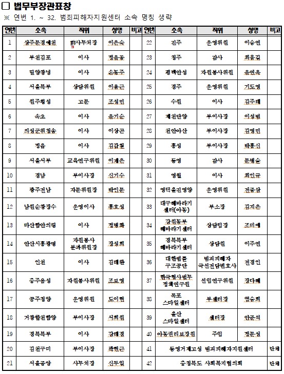 - 범죄피해자 보호ㆍ지원 정부포상(6명) 전수, 법무부장관표창(42명) 수여