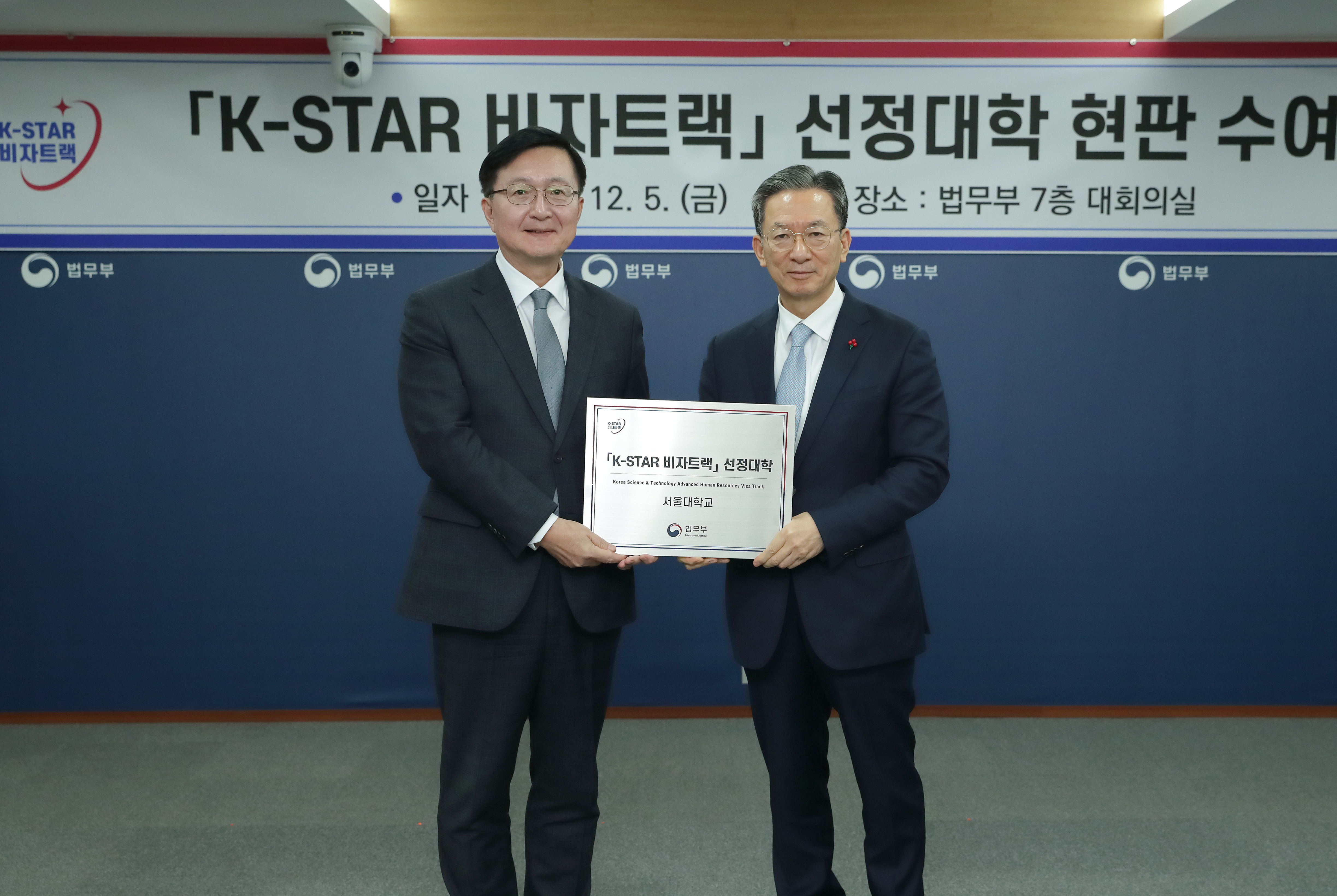 법무부(장관 정성호)는 12월 5일(금) 14:00 정부과천청사 1동 대회의실에서 「K-STAR 비자트랙」참여 대학으로 선정된 32개 대학에 현판‧지정증 수여식을 개최했다.